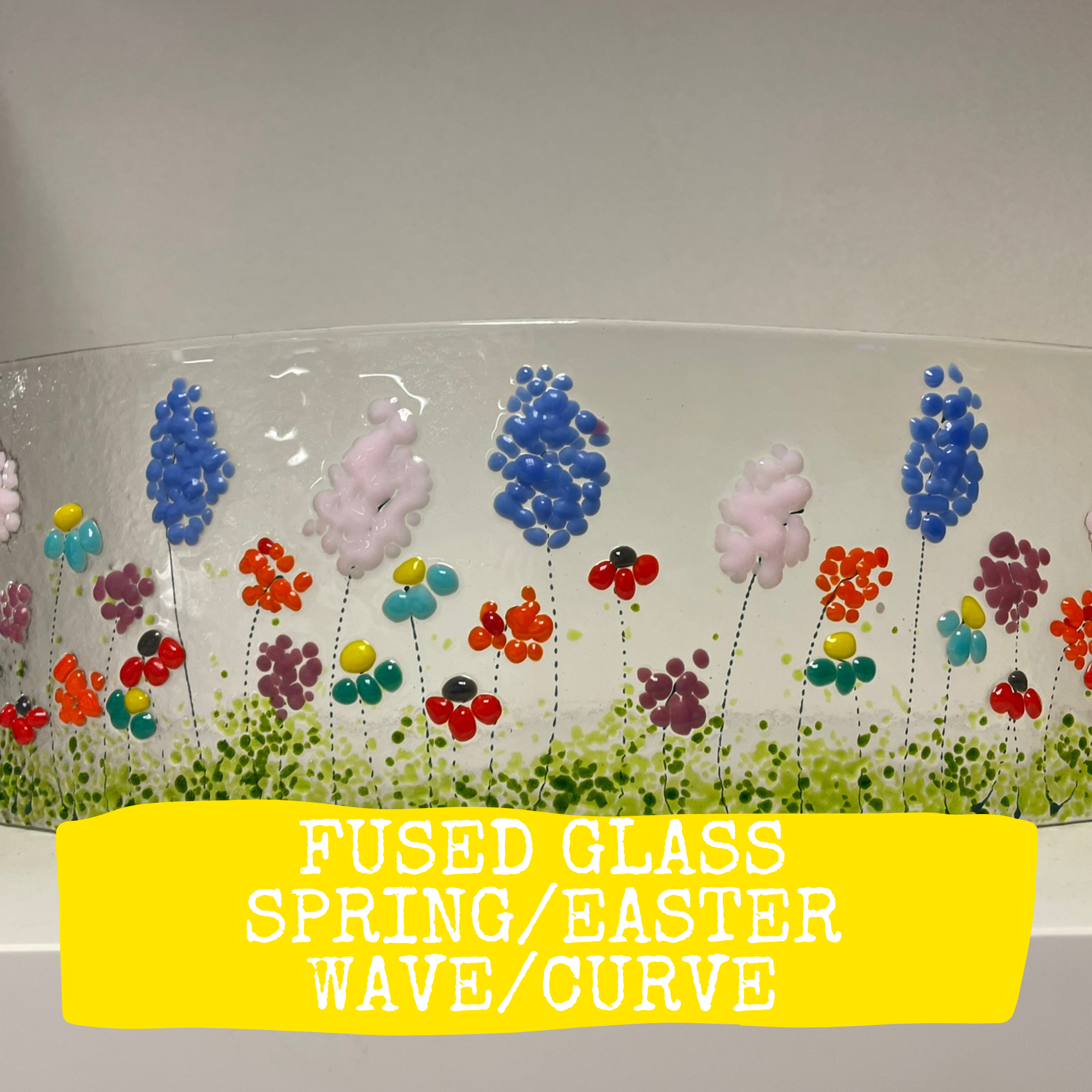 Fused glass waves or curves make a beautiful addition to your home, or as a gift. In this workshop you will learn how to cut glass as well as using all the different glass such as frit, stringers, liquid glass and bobbles to create a stunning design. It will measure approx 35cm x 12cm and can be a Spring/Easter design, or one for year round.